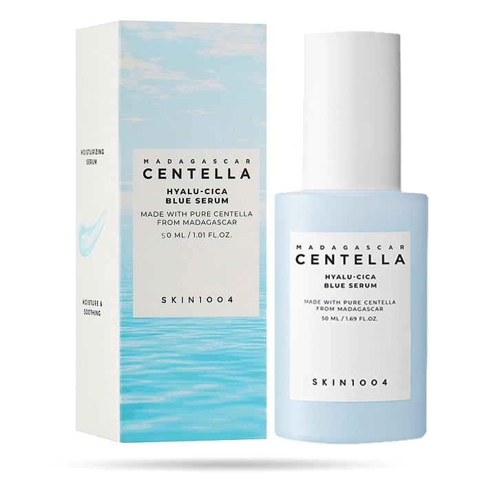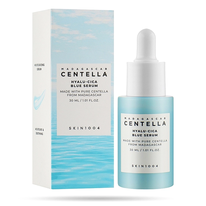 Madagascar Centella Hyalu-Cica Blue Serum شاهکار آبرسانی و آرامبخشی از برند محبوب کرهای SKIN1004 است. این سرم با استفاده از فرمول منحصربهفرد Hyalu-Cica™ (ترکیب هیالورونیک اسید و سنتلا آسیاتیکا)، تعادل کاملی بین آبرسانی عمیق و تسکین پوست حساس ایجاد میکند . با بافتی سبک ، جذب سریع و بدون چسبندگی ، این سرم انتخابی ایدهآل برای روتین روزانه همهی انواع پوست ، بهویژه پوستهای کمآب، آسیبدیده و تحریکپذیر است .